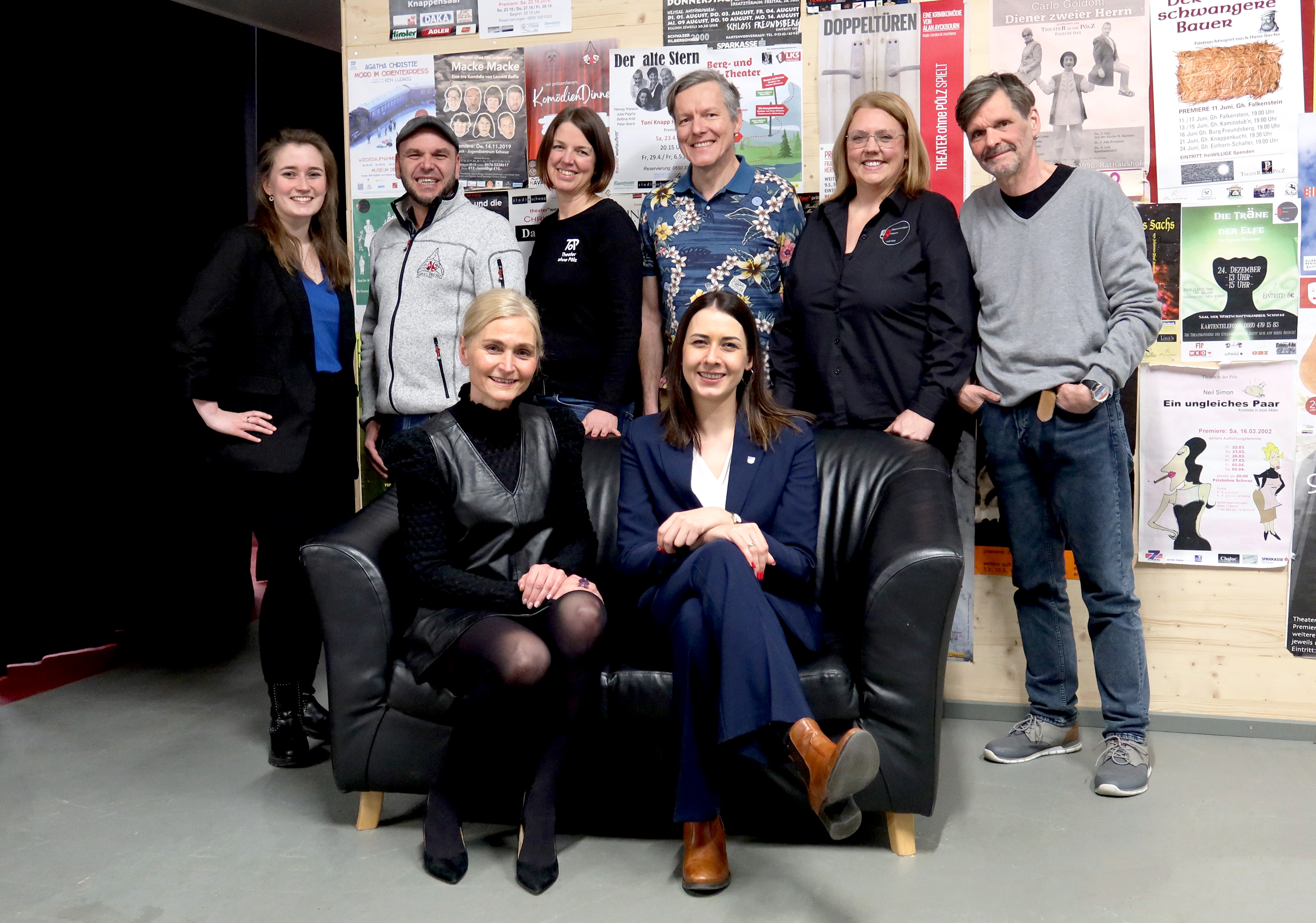 Bildunterschrift: Die Theaterschaffenden und die Vertreterinnen der Stadt Schwaz freuen sich über das erfolgreiche erste Jahr des „Gleis4 – Theater am Zug“ (v.li.n.re.): Elisabeth Mühlbacher (Obfrau Verein Gleis4), René Permoser (Obmann Theater SpielBerg), Karin Mascher (Obfrau Theater ohne Pölz), Daniel Lenz, Claudia Fröis (Laientheatergruppe Kulissenschieber), Chris Kohler (Theater „wortauftritt“) (stehend), Kulturreferentin Iris Mailer-Schrey und Bürgermeisterin Victoria Weber (sitzend v. li.)